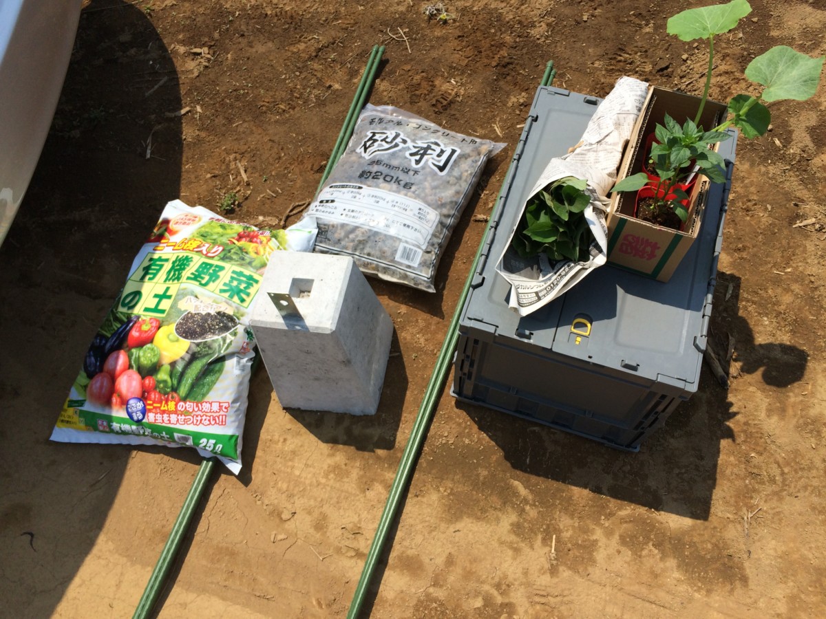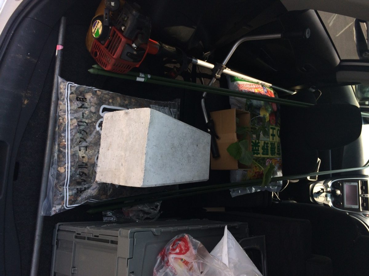刈払機の他に、砂利と束石、植え替え用の苗など一式です。今回は主にひまわりの種を蒔くための準備なので用意は少なめ