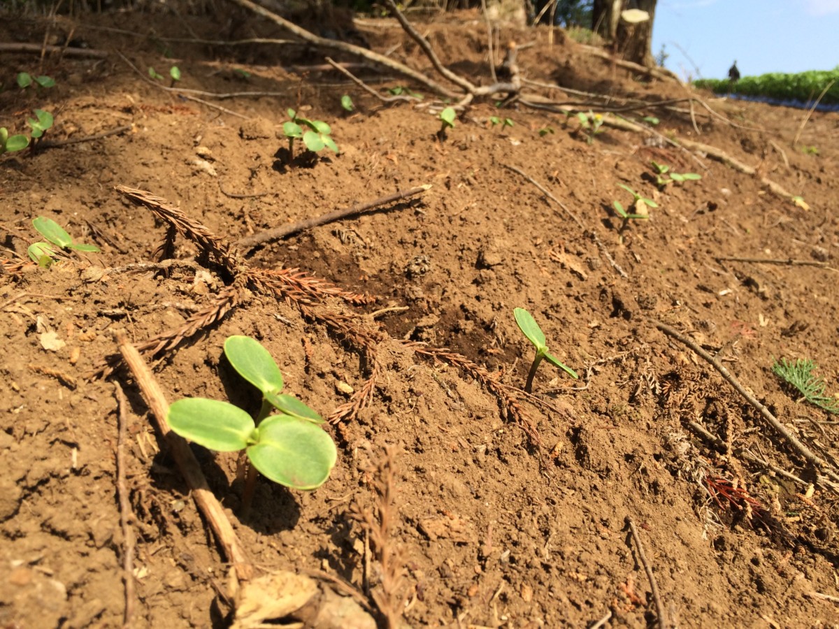 ゴールデンウィークにやってきました森です。ひまわりの種を蒔ききるために、今回は、去年末に倒した10本近くの倒木を可能な限り片付けて、刈払機で雑草を一掃し、簡単に土作りをして、種を蒔きます。