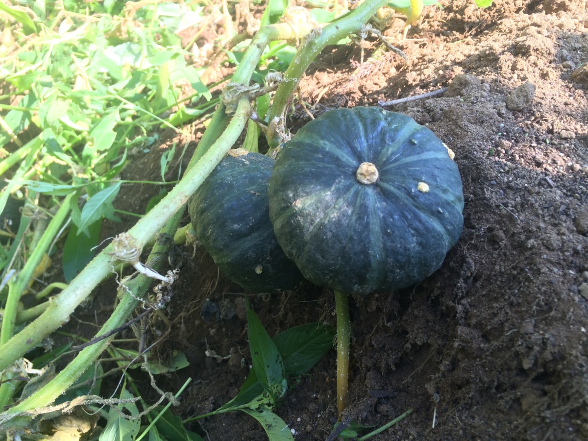 かぼちゃ(ぼっちゃん)は、拳二つ分の実が3つほど実ってました。