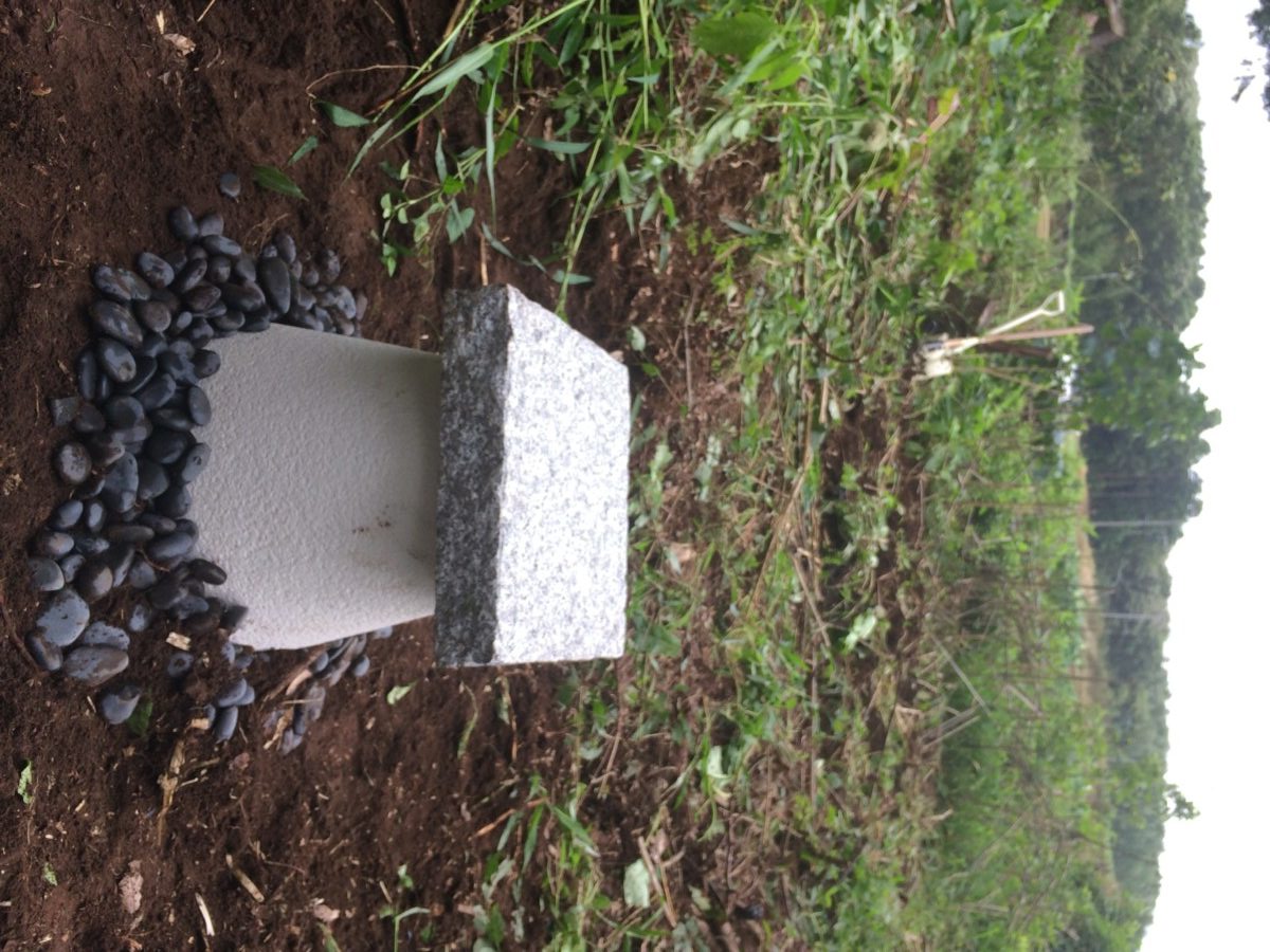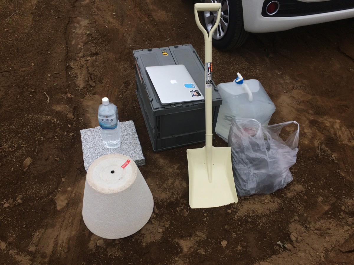 小屋の土台を設置するためのスコップと作業中に木陰で座って休める椅子が欲しかったので適当な御影石とFRP植木鉢を持ってきました。