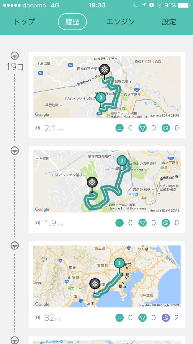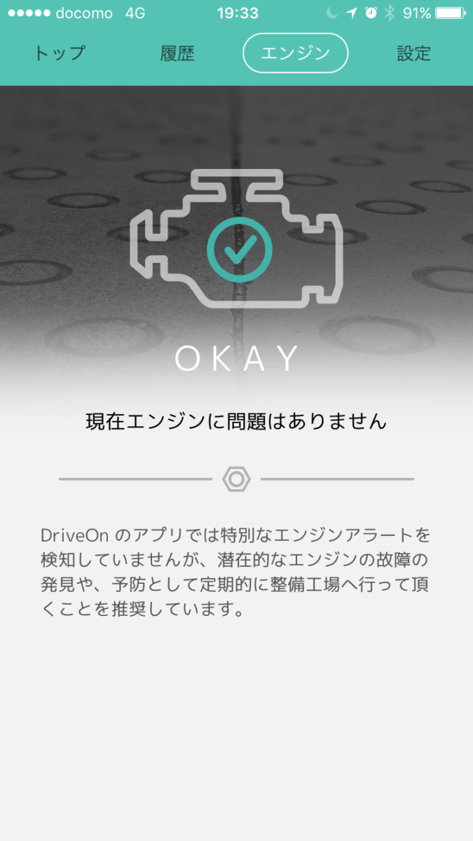 スマホにDriveOnのアプリをインストールして起動して必要な情報を入力すると、走行診断と走行結果のトラッキングができるようになります。