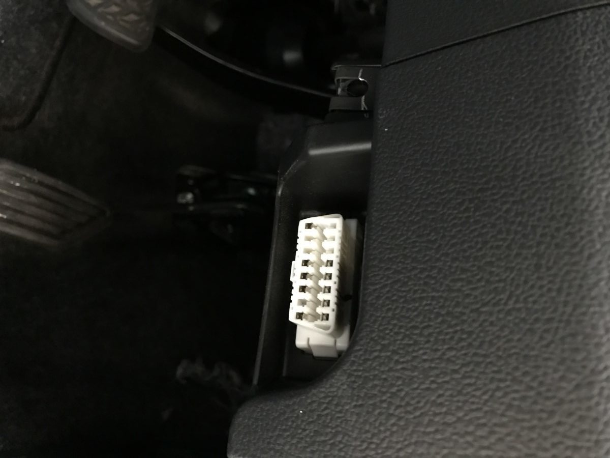 運転席前に下記のようなOBD-II端子があるので、ゆっくり慎重に機器を接続しましょう。