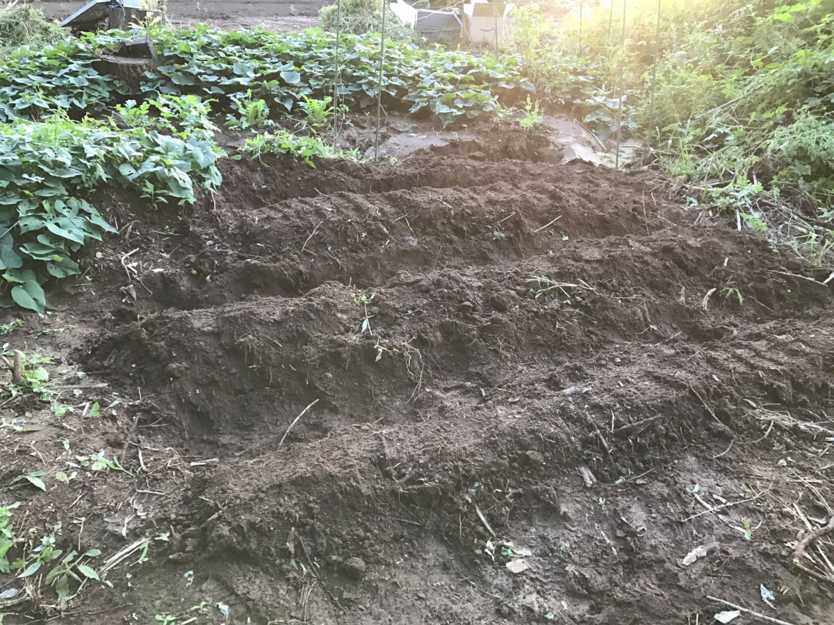 畝を4つ作ってもらい、奥から人参・大根・人参・サラダほうれんそうのタネを蒔きました。